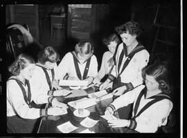 Photo caption from published version of 53-4503_002: "PREPARE CRESTS - Members of the Canadian Girls in Training of King St. Baptist Church prepare for the vesper service Sunday afternoon. Left to right are Carol Hawson, Linda Fuller, Judy Lang, Diane Oldfield, Shirley Leitch and Joan Hawson."