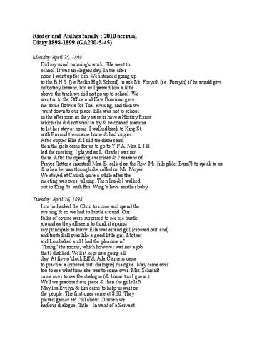 File consists of the diary of Martha Rieder covering the period from April 25, 1898, to July 11, 1899. Diary was kept in ink and pencil in an unlined notebook, and the author has dated the entries and separated them with a horizontal line. Enclosures: cutout of three roses, invitation.