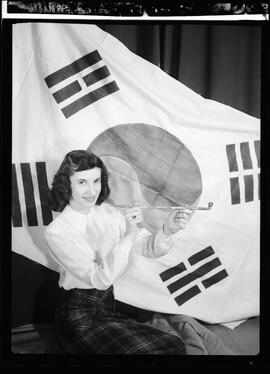 Photo caption from published version of 51-2744_001: "CURIOSITIES - Cpl. A. F. Woroch of Waterloo, who is serving with the Canadian special force in Korea, has set more souvenirs to The Record. Miss Elaine Slugaske, shown above seated before a South Korean flag, holds an unusual bamboo pipe."