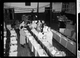 Photo caption from published version of missing photo [see 51-3066_001 for closest version]: "PACK YULE HAMPERS - Salvation Army volunteers are shown packing 100 Christmas hampers valued at $18 each to be distributed in the Twin City and district. They include a Christmas dinner and children's clothing individually packed for each family. Clockwise from left, are Mrs. E.A. Lachmann, Mrs. Harold Tillsley, Mrs. Arthur Rawlins, Capt. Arthur Rawlins, Mrs. Thomas Tillsley, Mrs. Mary Williamson and Kenna Rawlins."