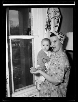 Photo caption from published version of 54-6580_001: "CLOSE CALL - Mrs. William Schedewitz, 27 Bridge St., Bridgeport, and six-month-old son, Jimmy display the rock which came through their living room window last night. Mr. Schedewitz, an employee of the Canada Skate Manufacturing Company, Ltd., said he was followed home by strikers after work."