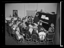 Photo caption for published version of 54-6586_001: "YOUNG VOICES - Summer Bible schools opened at 16 Twin City churches this week. Miss Marilyn Bielstein (at piano) leads leads this group of nursery kiddies in a song at St, Mark's Lutheran Church."
