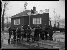 Photo caption from published version of 54-6603_001: "WAILING WINNIE - Two men (left) [photo not in envelope and likely from different shoot] pause in the doorway of a King St. store as they listen to the wailing of the test. School children (right) hold their ears standing in front of the siren at East and Stirling Avenues."