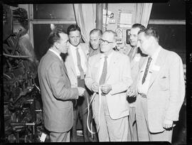 Photo caption from published version of 54-6637_002: "VISIT THE RECORD - James Anderson, advertising manager of The Record, shows visitors tape from teletypesetter. Left to right are Mr. Anderson. Lem Winsett, Marion Star, Marion S.D.; Gene Raymer, Ontario provincial police, Port Credit; Gus Steinbeck, Franklin County Tribune, Union, Miss.; Cecil Halliday, Colonial Coach Lines, Ottawa; Abe Lincoln, Northern Great Lakes Area Coach, Chicago."